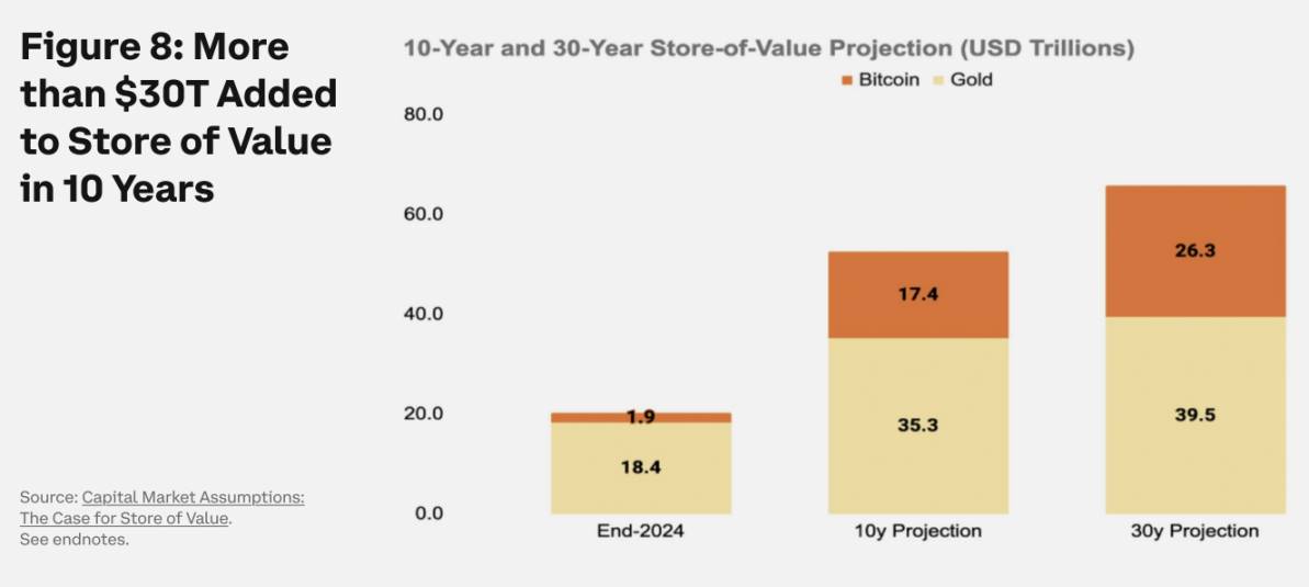 高企的股票估值和持续的政府借贷压低了长期回报预期,根据严谨的资本市场假设和前瞻性模型,美国股票的年回报率预计为 7%,美国债券为 4%,这与现金回报基本一致。在这种低收益环境下,投资者不得不探索创新的资本保值策略,而比特币成为了一个突出的选择。