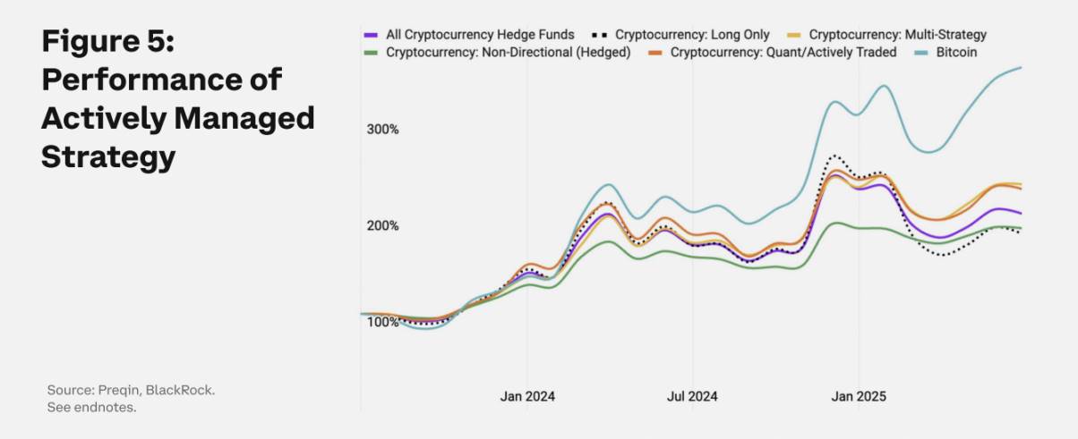 主动管理的加密策略是否能增加投资价值?答案是复杂的,有好有坏。贝莱德 Preqin 的数据为自 2020 年以来的主动管理加密基金提供了基准。涵盖了五种策略:做多比特币、纯多头加密货币策略、多策略、市场中性对冲策略和量化基金。从较长时间跨度来看,风险调整后回报略优于基准,但在机构化阶段(例如 2022 年至今)则大幅落后。