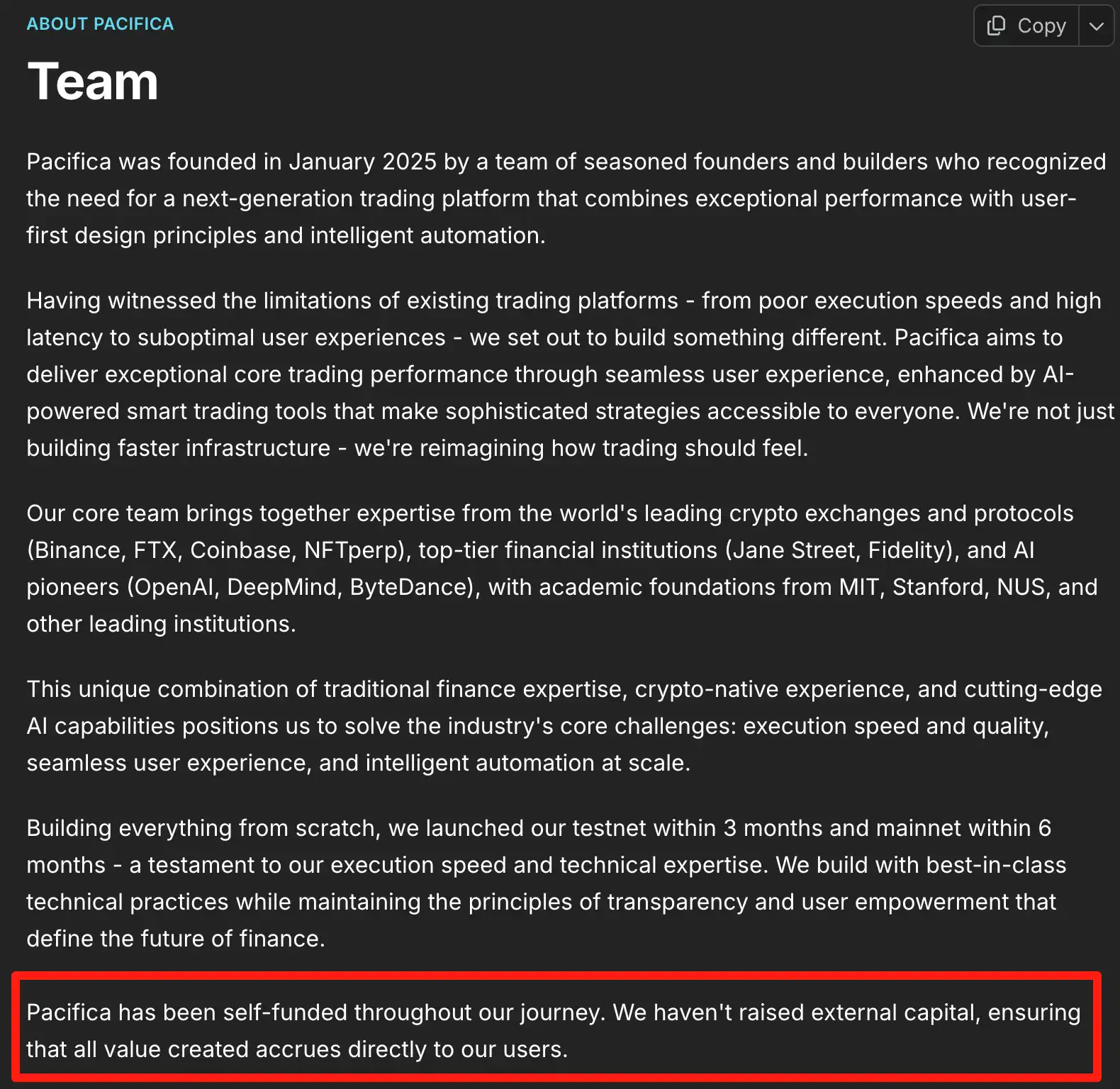 据官网显示,Pacifica 核心成员来自币圈顶级交易平台 Binance、FTX、Coinbase、NFTperp、顶级金融机构 Jane Street、Fidelity 和人工智能先驱 OpenAI、DeepMind、ByteDance,并拥有来自麻省理工学院、斯坦福大学、新加坡国立大学和其他领先机构的学术基础。