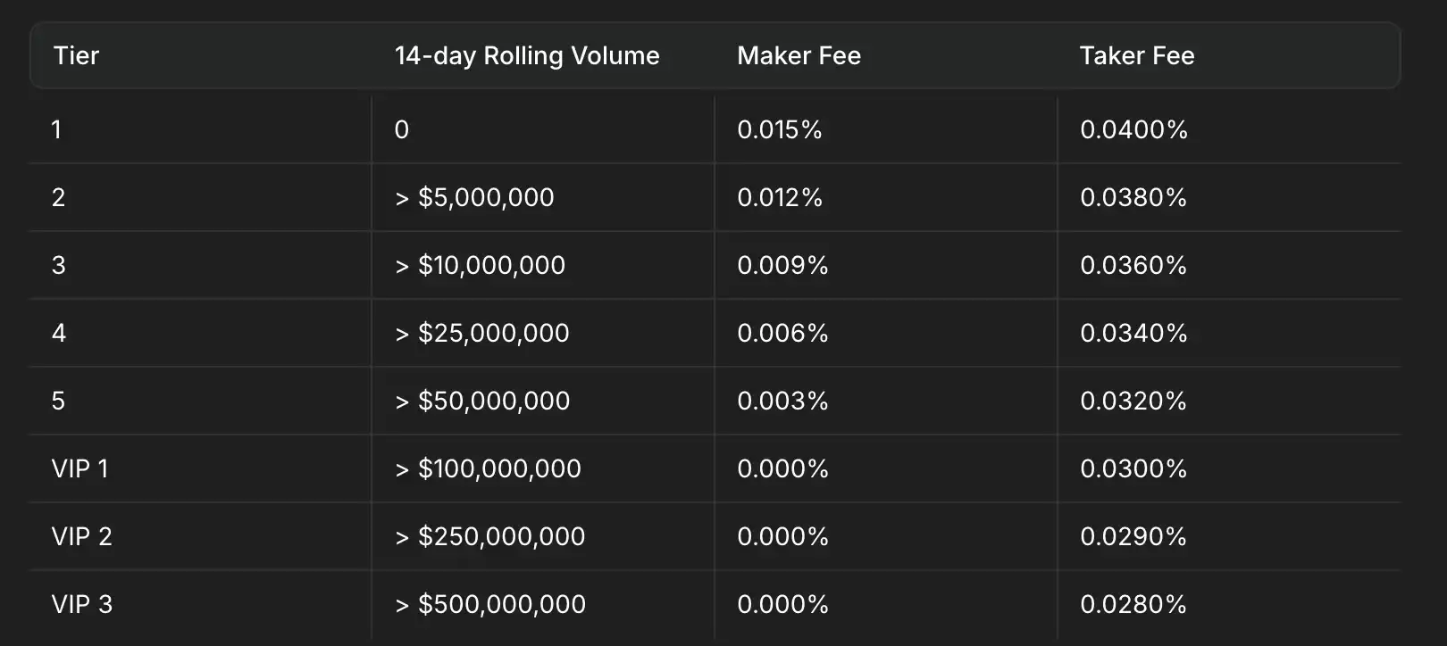 Pacifica 的手续费等级完全根据交易量来决定,根据账户过去 14 天的交易量每日更新。所有子账户与主账户共享相同的费用等级。子账户的交易量计入主账户费用计算的总额。