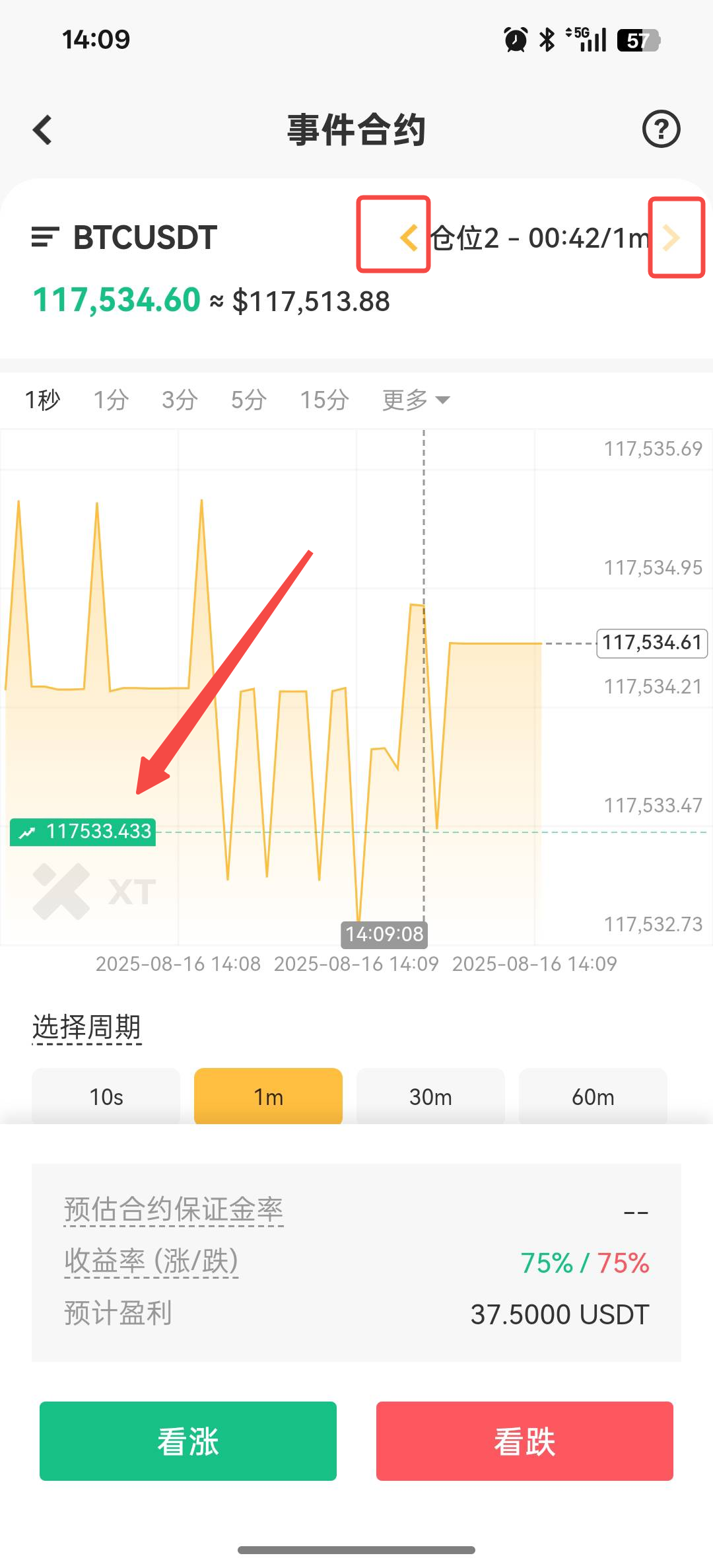 打开 XT APP,登录账号,在合约交易页面点击顶部的 「事件合约」 入口,即可进入交易界面。