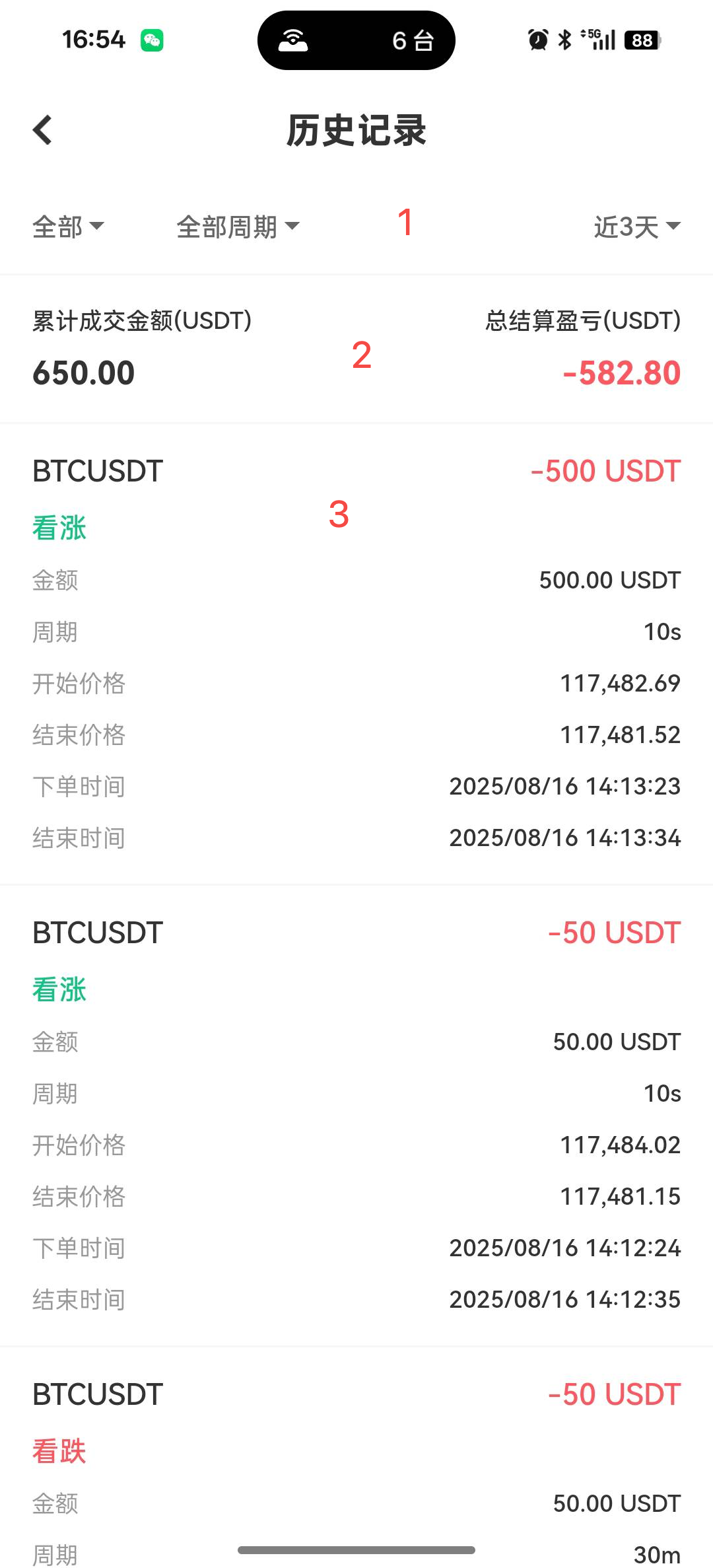 下单成功后,您可以在事件合约首页向下滑动,查看当前持仓的仓位信息。若需查看历史订单,点击右侧记录图标,即可进入历史记录页面(图7)。