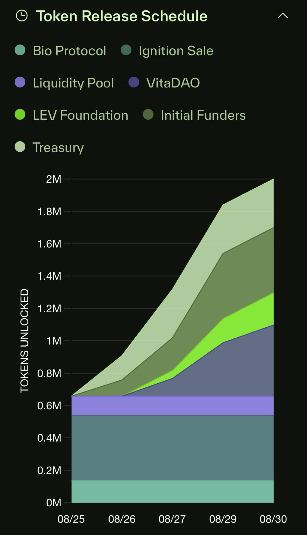 目前 AUBRAI 的代币经济学已经公布,总供应量 200 万枚,代币分配为:20% 用于销售、6% 用于流动性池、15% 归财库所有、20.1% 分配给初始资助方、10% 分配给 LEV 基金会、22% 分配给 VitaDAO、6.9% 分配给 Bio Protocol。