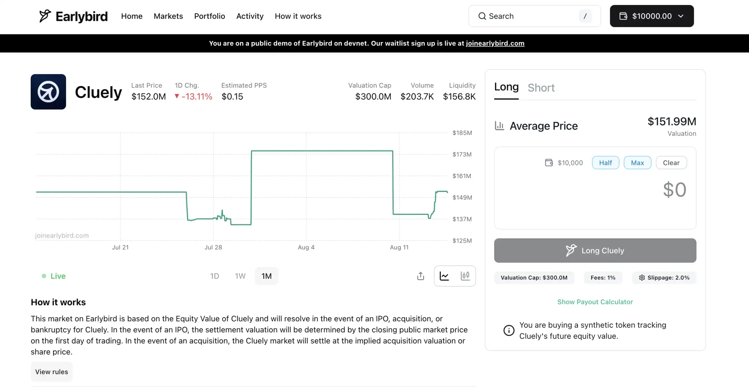 Earlybird 的具体产品形式尚未全面公开(平台仍处于申请制封闭测试阶段)但可以从 Dev 测试网 进入体验产品(会有 1 万美元的体验金 lol),从其宣传看很可能和 Ventuals 异曲同工,利用链上衍生品或模拟资产,让用户押注未上市公司的估值涨跌。Solana 高速低费的链上环境,同样适合搭建实时交易市场。团队或许会采用订单簿(orderbook)或 AMM 做市商机制,来提供比传统 OTC 更连续的流动性。值得一提的是,Solana 上已有类似 Pre-IPO 资产交易的实践,例如 PreStocks,以及更早的链上美股(如已经销声匿迹的 Mango Markets 上的 mStock 合成资产)。