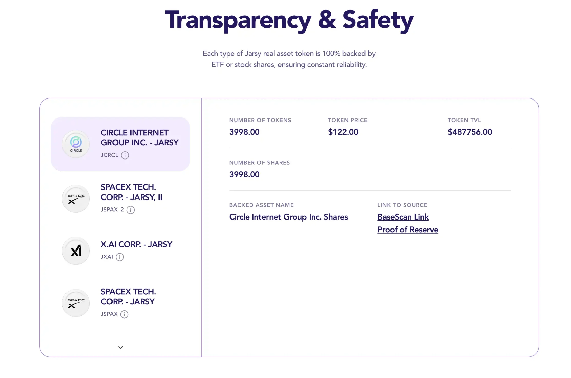 Jarsy 同样会将所有持有的股票资产放在专门的 SPV(特殊目的载体)中托管,并提供实时的链上储备证明页面供查询。投资者购买的每一枚 Jarsy 代币(如 JSPACEX 代表 SpaceX 股份)都有对应一股真实股票作为支撑。虽然代币持有人不是该公司的法律股东,但享有与持股几乎等同的经济权益,包括未来 IPO 时的变现、被收购时的对价,甚至可能的分红收益。这也让 Jarsy 跟上述的其他项目不太一样,而更像是一个私募股权的「团购网站」。