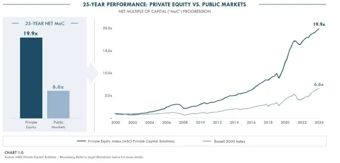 过去 25 年私募市场与公共股市价值创造的对比图表,源:Dawsonpartners
