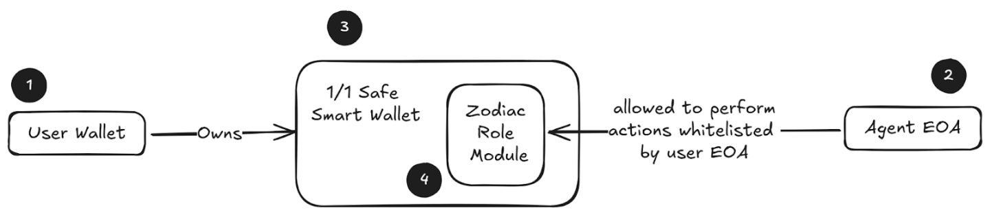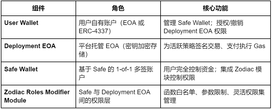 钱包体系是确保资金安全与策略执行可控的核心。Almanak 采用 Safe Zodiac 的非托管方案,确保用户对资金的完全所有权,并将策略执行所需的权限精准、可控地委派给自动化执行账户(Deployment EOA)。用户通过 User Wallet(EOA 或 ERC-4337 智能账户)直接控制 Safe Wallet。Safe Wallet 内嵌 Zodiac Roles Modifier 模块,允许为 Deployment EOA 设定严格的函数白名单与参数限制,确保「只能做被允许的事」,且权限可随时撤销。