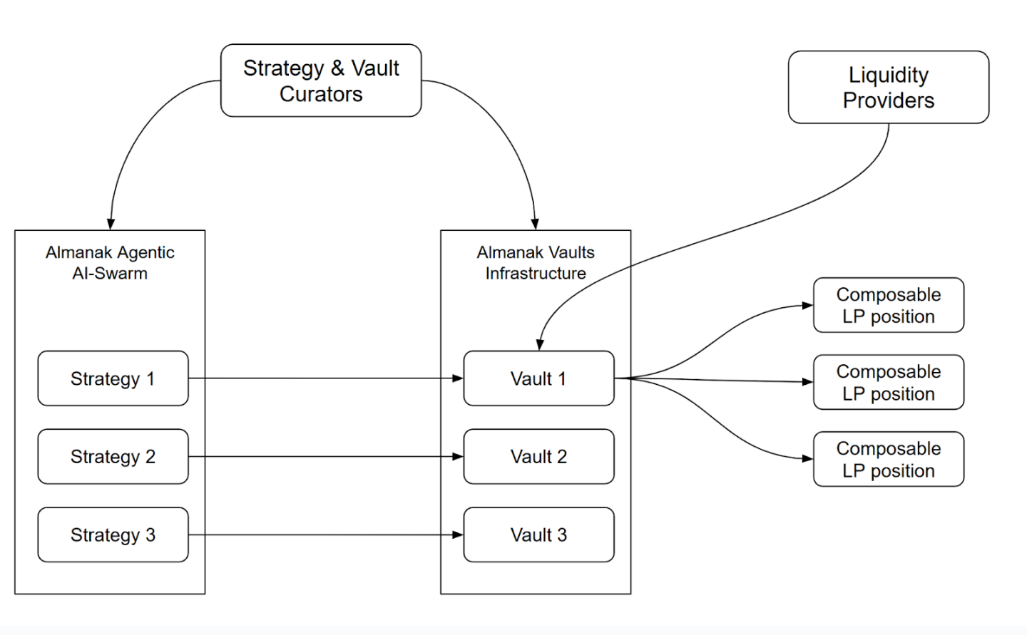 Almanak 的代币经济体系旨在为 AI 驱动的金融策略构建高效、可持续的价值交换网络,使高质量的策略与流动性资本在链上实现高效匹配。平台通过双核心角色策略与金库策展人(Strategy & Vault Curators)和流动性提供者(Liquidity Providers)构建生态闭环:前者利用 AI 智能体集群(Agentic AI-Swarm)在无代码环境中设计、优化并管理可验证的确定性策略,通过部署无许可金库(Vault)引入外部资金并收取管理费与业绩分成;后者则向这些 Vault 存入资金,以获得代币化的策略敞口并参与收益分配。
