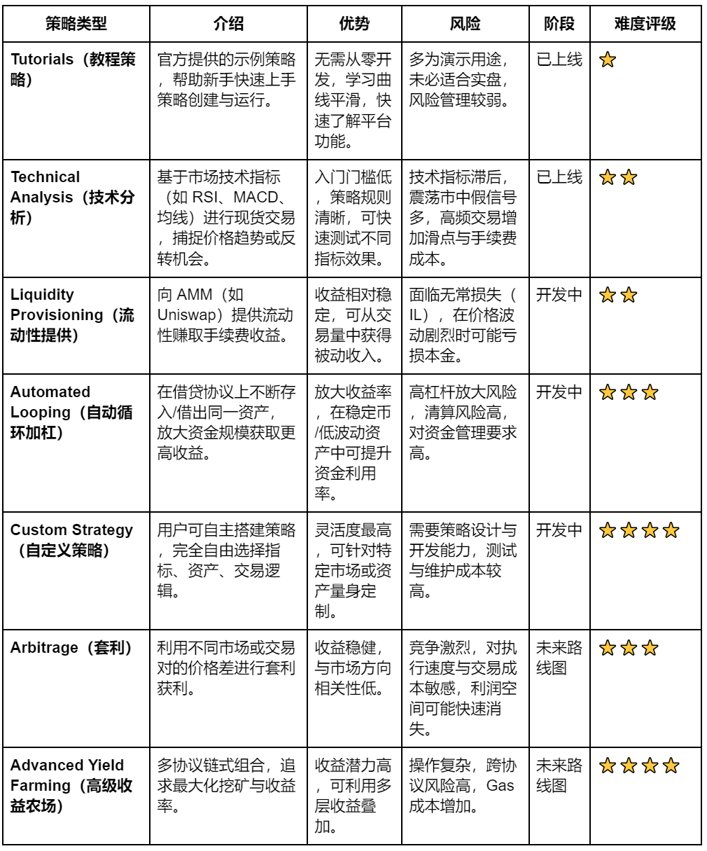 其次,策略层级仍偏基础。现有策略以入门级技术分析(TA)为主,距离机构级或专业量化水准仍有差距。未来需引入更丰富的高级策略库(涵盖链上流动性管理、资金费率套利、跨池价差、以及多信号融合等),并完善回测与模拟交易工具、内置成本优化引擎及多策略组合管理功能,方能成长为散户进入 DeFi 量化的首选入口。