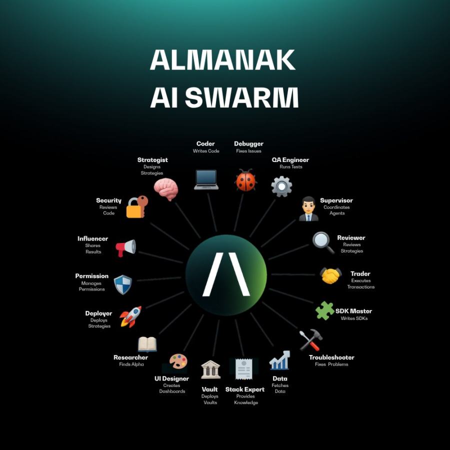 Almanak AI Swarm 架构作为覆盖完整策略开发周期的一站式平台,能够在用户完全掌控与资产非托管的前提下,自主完成复杂 DeFi 策略的研究、测试、创作与部署,旨在模拟并替代传统量化交易团队的全流程作业。值得注意的是,AI Swarm「团队」均由 AI 智能体构成并非真人。