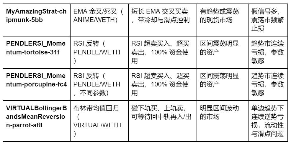 Almanak 已上线的策略可分为两大类:LP 系列(Dynamic LP Blue Chip、Dynamic LP Degen)与指标现货策略(MyAmazingStrat、PENDLERSI_Momentum、VIRTUALBollingerBandsMeanReversion),详细策略内容如下表: