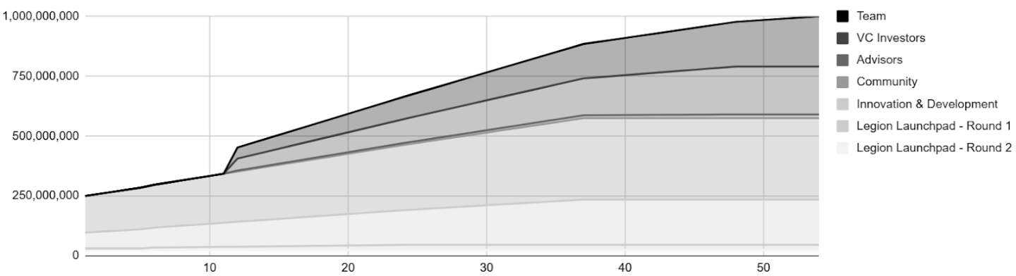在代币分配上,Almanak 设置了团队(54 个月线性释放,12 个月锁仓)、机构投资人(48 个月线性释放,12 个月 锁仓)、顾问(48 个月线性释放,12 个月 锁仓)、创新与生态发展(TGE 释放 35%,余下 36 个月线性释放)、社区与早期参与者(TGE 释放 45%)、Legion 社区轮(分两轮,第一轮 30% TGE 24 个月线性释放,第二轮 100% TGE)。排放池(Emission)用于奖励网络参与者及早期激励,并按年度减半的通胀模型分配,保持长期的激励与治理活跃度。