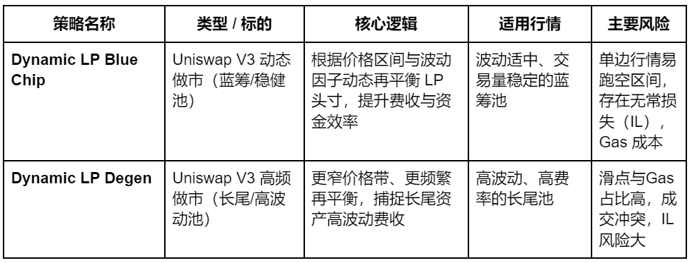 实盘最小可行组合:Dynamic LP Blue Chip(稳态费收) RSI/BB 一类现货策略(做波动捕捉) 小额部署 Degen LP 或 EMA 交叉 做「高波动试验田」。
