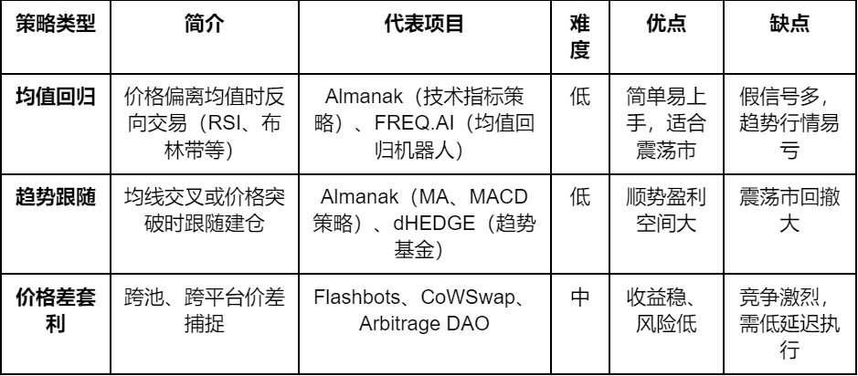 当前链上量化金融仍处于早期阶段,受多重因素制约难以支撑复杂量化策略的落地:一是市场结构方面,流动性深度不足且 AMM 缺乏超高速撮合机制,限制了高频与大额交易的可行性;二是执行与成本方面,链上出块延迟与高额 Gas 费用使频繁交易难以盈利;三是数据与工具方面,开发与回测环境不完善,且数据维度单一,缺乏企业财务、宏观经济等多源信息。在可实际落地的 DeFi 量化策略中,目前的主流方向集中于: