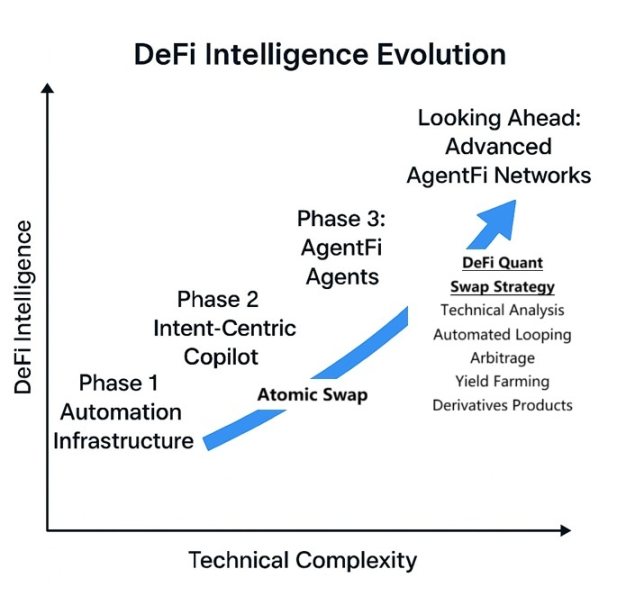 在我们对 AgentFi 未来的高阶畅想中,除借贷(Lending)与流动性挖矿(Yield Farming)这两大近期最具价值且易落地的场景外,Swap 组合策略同样是潜力方向。当多个 Swap 按顺序或条件组合时,便形成「策略链路」,例如套利或收益搬砖。这种模式需要状态机管理持仓、条件触发与多步骤自动执行,具备了 AgentFi 的完整闭环特征——感知 → 决策 → 执行 → 再平衡。