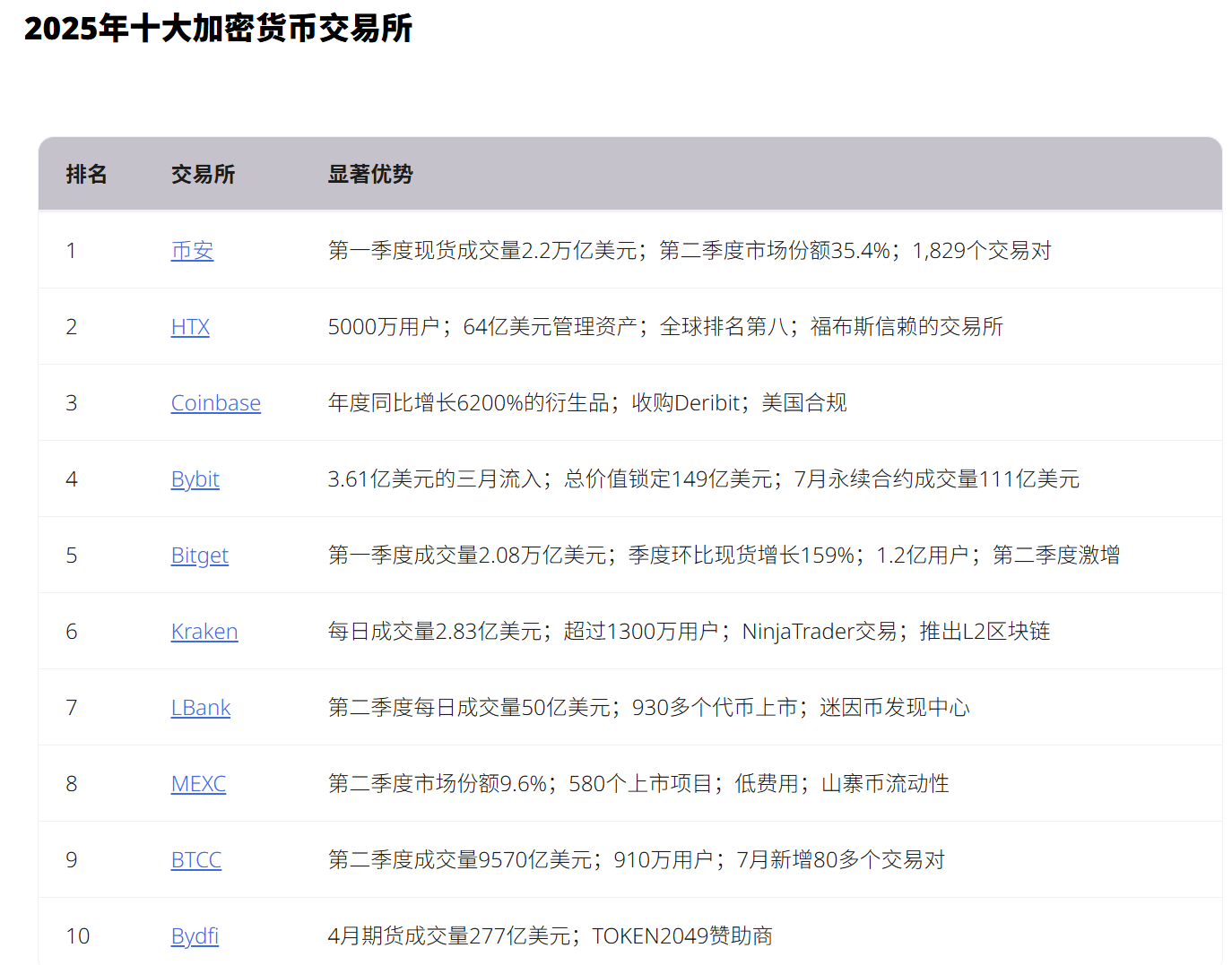 Bitcoin.com《2025年全球十大加密交易所》评选,火币HTX榜上有名,并被称为“增长速度最快、最具潜力的交易所之一”。报告指出,火币HTX在用户信任度、技术架构与产品丰富度方面的进步,成为其跻身行业第一梯队的重要原因。