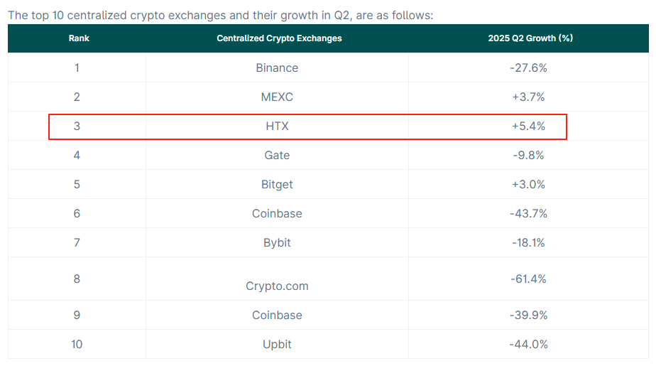 CoinDesk 7月交易所报告显示,2025年至今,火币HTX市场份额涨幅仅次于币安