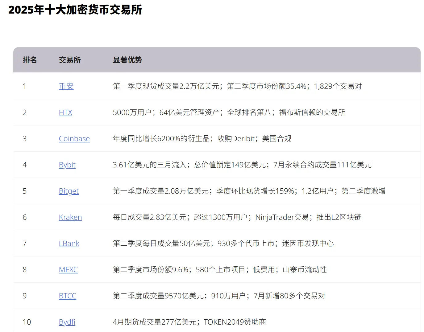 Bitcoin.com《2025年全球十大加密交易所》评选,火币HTX榜上有名,并被称为“增长速度最快、最具潜力的交易所之一”。报告指出,火币HTX在用户信任度、技术架构与产品丰富度方面的进步,成为其跻身行业第一梯队的重要原因。