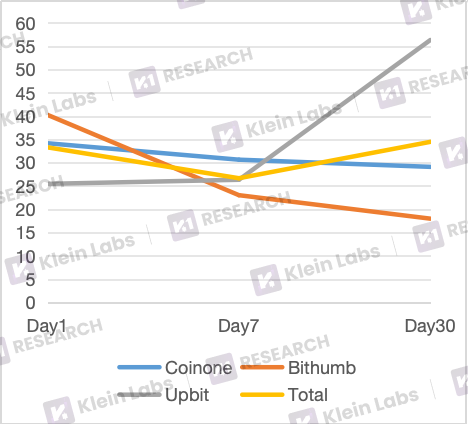 ● Coinone :价格变化幅度最小,显示出较高的稳定性和可预测性。在整个观察期内,其价格走势平稳,第30天的涨幅甚至超过 UPbit,表明即便短期波动有限,代币仍具备持续上涨潜力。这种平稳的收益率意味着投资者面临的价格波动风险相对较低,更适合追求稳健收益和长期投资价值的投资策略。