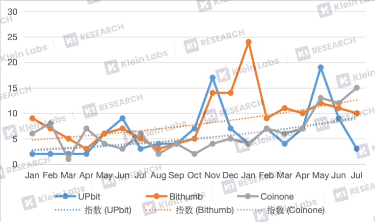 ● 前三大交易所之中的UPbit和Coinone,上币数量则基本持平。呈现出更加稳健和审慎的上币策略,侧重于维持现有生态稳定和合规性要求。