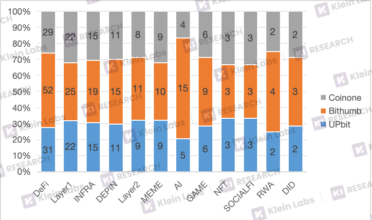 ● Bithumb在统计期间上币数量位居首位,且与UPbit、Coinone相比,其新增代币中在DeFi与AI赛道的比重更高,充分体现了Bithumb在2024年AI热潮中对市场机会与热点的敏锐捕捉,以及在上币策略上的快速响应。