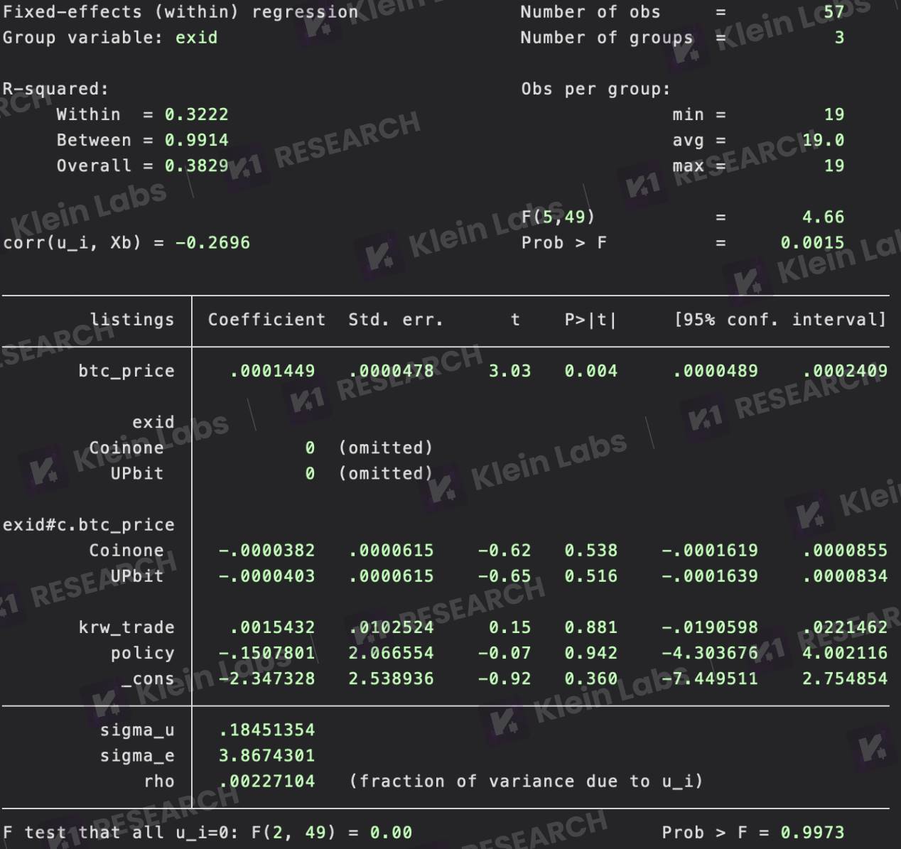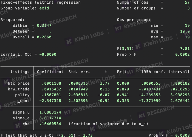 本部分采用面板数据固定效应回归模型,旨在系统评估BTC价格、韩元计价交易量及政策因素对韩国主要交易所上币数量的影响。