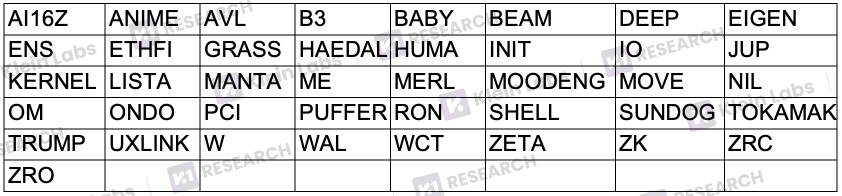 ● 在DeFi赛道中,三家交易所共同上线的大型海外优质项目共有 BABY、COW、DEEP、DRIFT、ENA、HAEDAL、JTO、JUP、KERNEL、PUFFER、W、ZRO 这12个标的,均为在全球范围内具有较高知名度与用户基础的代表性项目,显示出交易所在高质量DeFi资产选择上的趋同性。