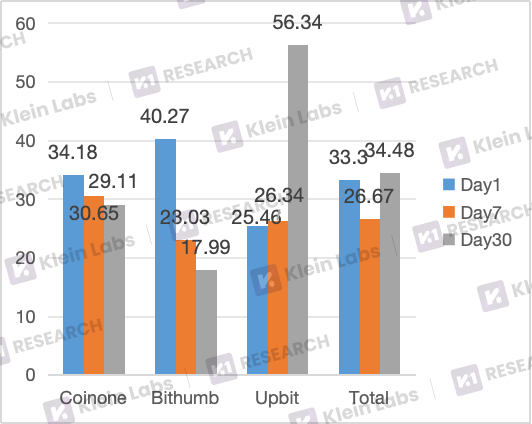 从价格表现的时间分布分析来看,Coinone 上市代币的总体收益率表现最佳。在 第1天、第7天、第30天 三个观察窗口中,Coinone 在两个时间节点的收益率均高于代币总体平均水平,而其余一个时间节点略低于平均值。相比之下,UPbit 与 Bithumb 仅在一个时间节点表现优于平均值,其余时间段均落后于市场整体水平。