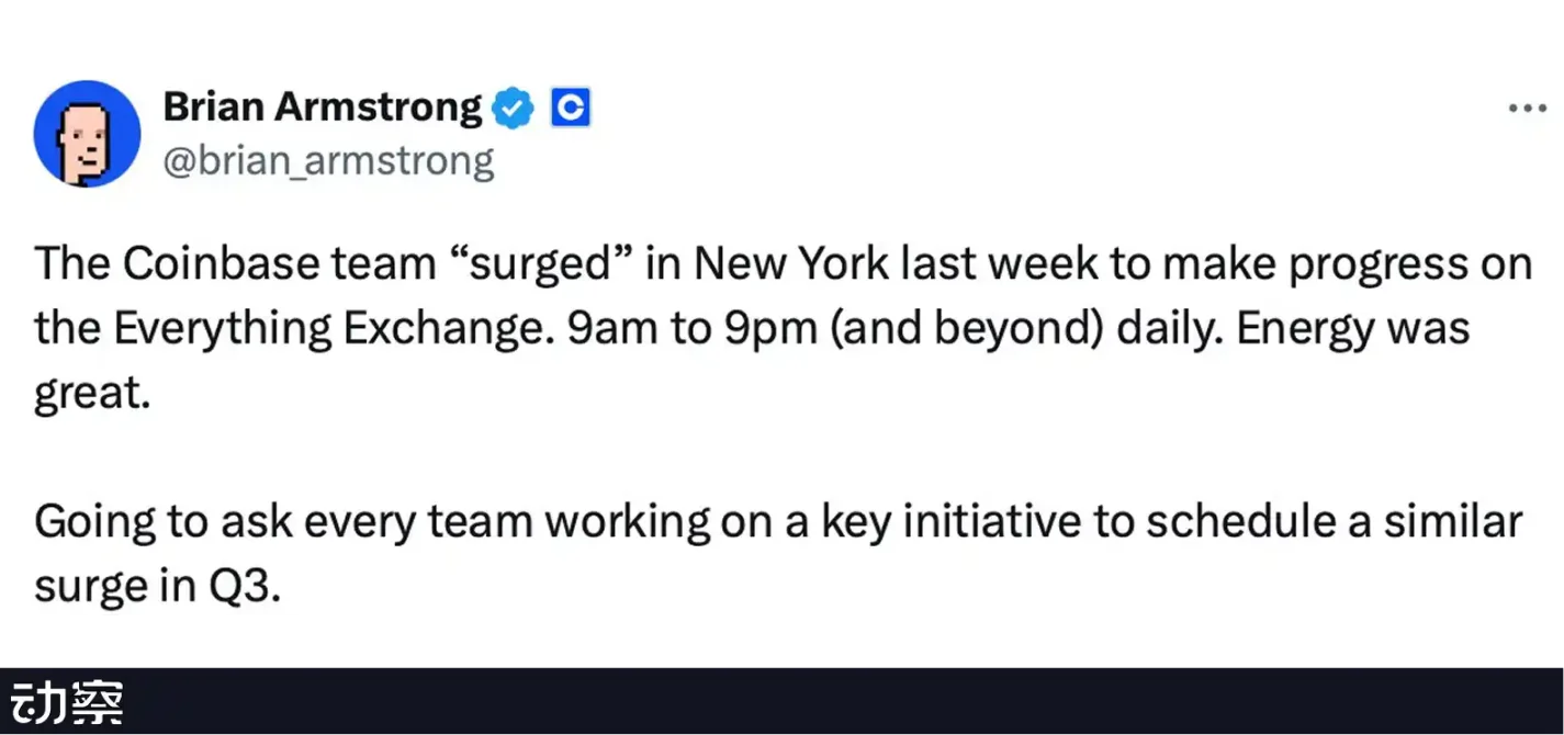 CEO Armstrong 在推特炫耀:纽约团队已经集结加班加点开发 Everything Exchange(万能交易所),每天 9 点到 9 点,甚至更晚。