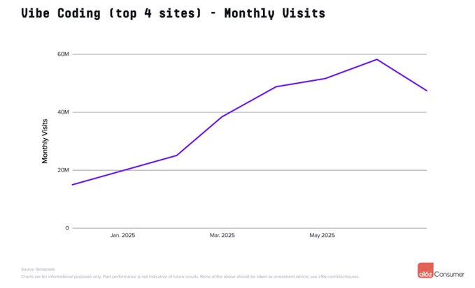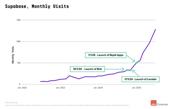 自 ChatGPT 以来,我们还没有见过像 vibecoding 这样的现象级增长!@lovable_dev @replit 首次登上网页端榜单,@boltdotnew 入选了边缘榜单(Brink List)。数据显示,这些平台不仅推动Vibe应用使用量,还带动了相关平台(如Supabase)的流量增长!