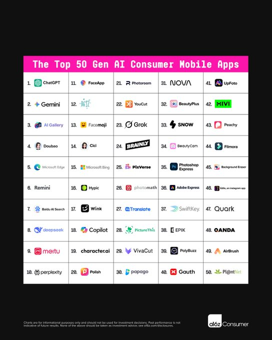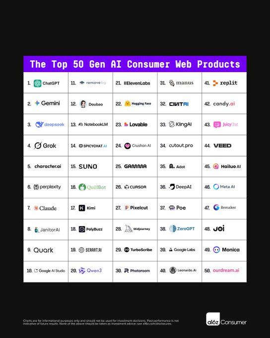 @a16z 发布第五次全球 AI 应用榜单:100强揭晓!