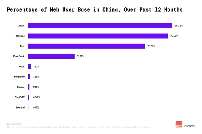 由于 ChatGPT、Claude 等被禁,中国本土生态快速发展:Quark(夸克)、Doubao(豆宝)、Kimi 等凭借国内用户量跻身榜单。且主要在中国使用。更令人瞩目的是,7 家网页公司和 22 家移动应用公司虽源自中国,却凭借全球用户量成功上榜!