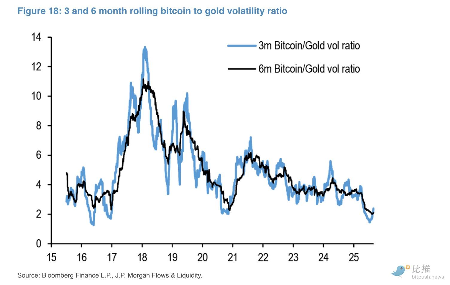 「比特币的波动性已经降至历史最低点,使其在机构投资者眼中比黄金更具吸引力,」 摩根大通在最新研究报告中直言不讳地指出,这家华尔街巨头明确表示,比特币相对于黄金被明显低估。