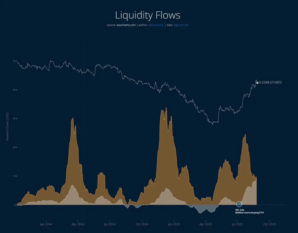 8 月 27 日,加密分析师 Willy Woo 指出,资金正从比特币流向以太坊。当前 以太坊每日资金流入规模接近 9 亿美元,已逼近比特币的资金流入水平。此次流入潮与 Tom Lee 旗下 BitMine 大规模增持 ETH 的行为同步,进一步强化了以太坊近期的相对强势。