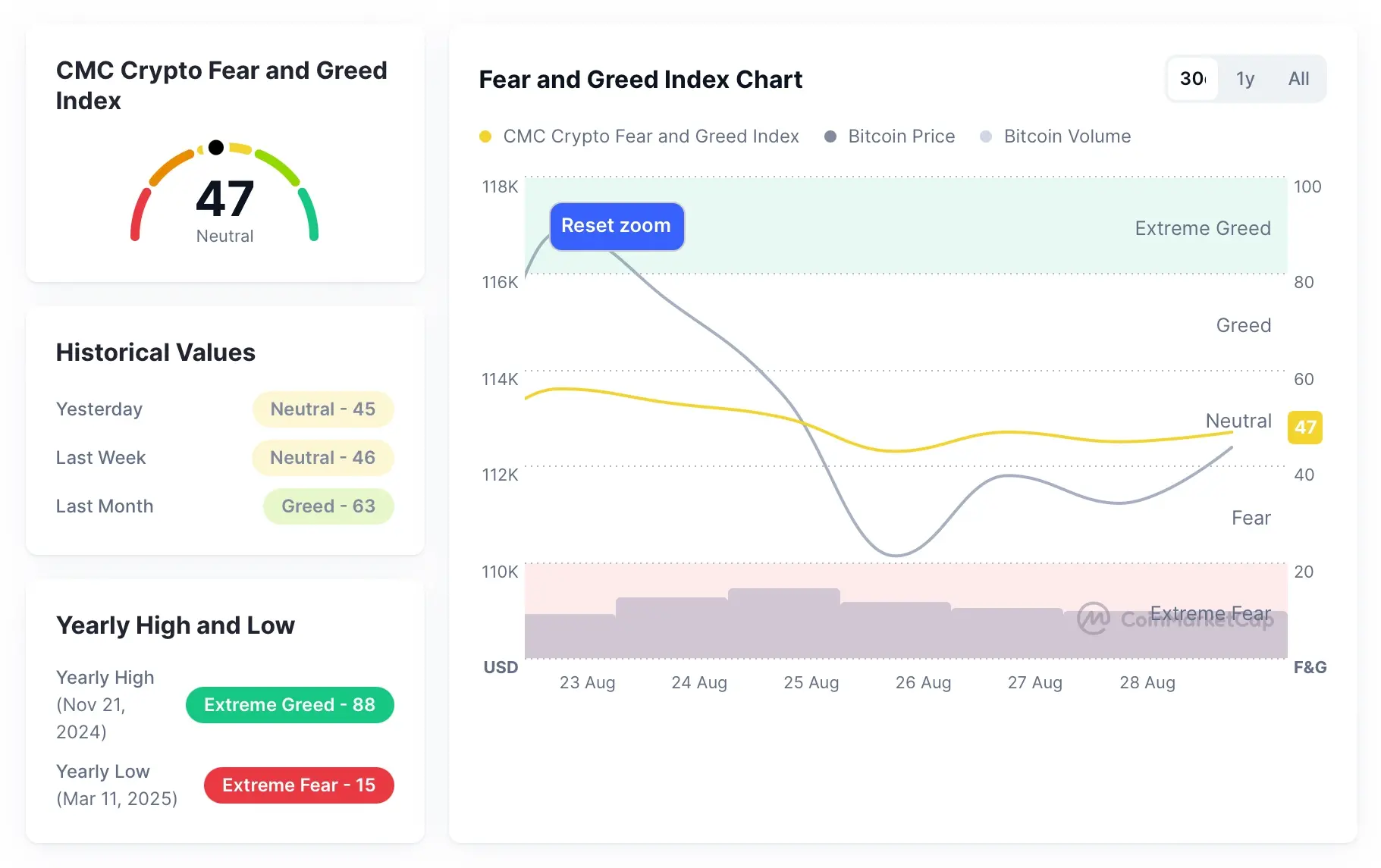 截至 8 月 29 日,恐惧与贪婪指数(Fear & Greed Index)报 47 点,处于“中性”(Neutral)区间,显示市场情绪在震荡格局中略显谨慎,投资者整体仍以观望为主,缺乏明确的方向性信号。