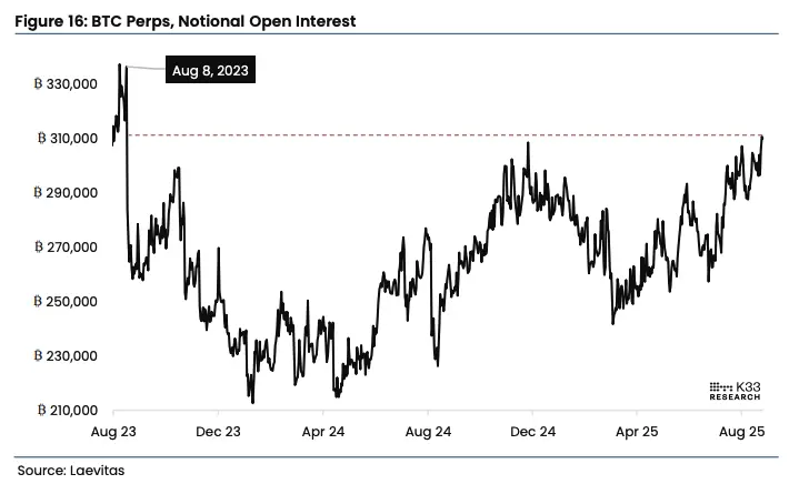 - K33 Research 报告:比特币永续期货未平仓量攀升至 31 万 BTC(约 340 亿美元),创两年新高。过去两个月新增 41607 BTC,上周末单周激增 13472 BTC。与此同时,年化资金费率自 3% 升至近 11%,显示杠杆过度累积。