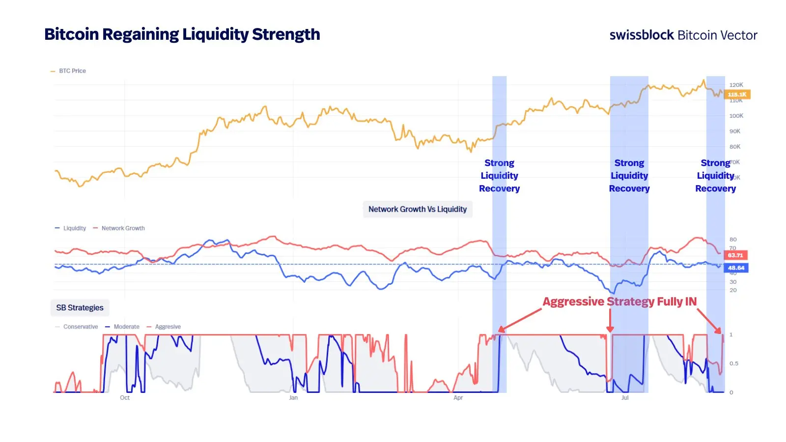 8 月 24 日,Bitcoin Vector 报告显示,比特币链上流动性出现回升。历史上,每一次流动性复苏都伴随着比特币价格的持续上涨。Swissblock 已将其策略调整为激进配置,并认为当前流动性特征与过往牛市初期高度相似。