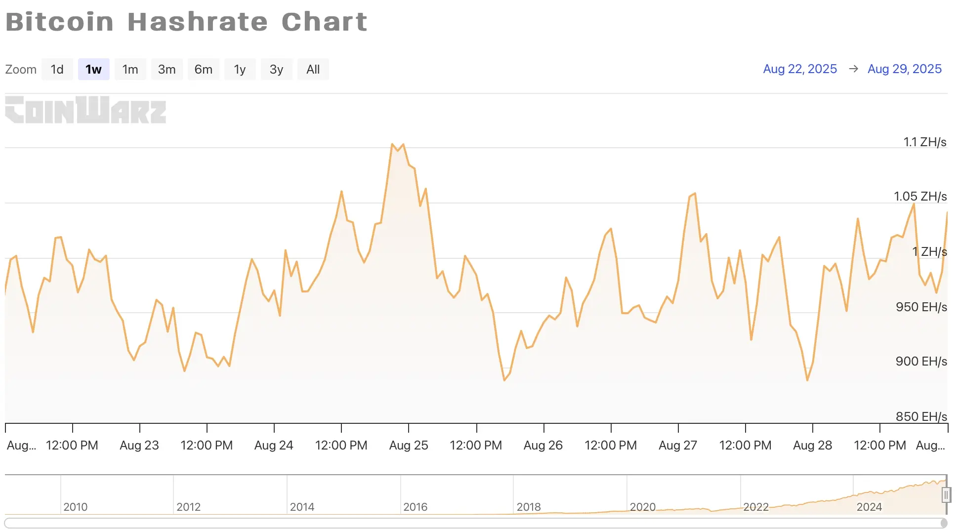 8 月 23 日至 24 日,哈希率震荡攀升,自 897.09 EH/s 稳步攀升至 1.1034 ZH/s,显示出矿工算力在短期内快速集结的态势。然而,8 月 25 日,网络哈希率出现急速回落,一度下探至 888.675 EH/s,表明部分算力在高位迅速退出,可能与比特币价格波动、矿机调配或区域性算力波动相关。