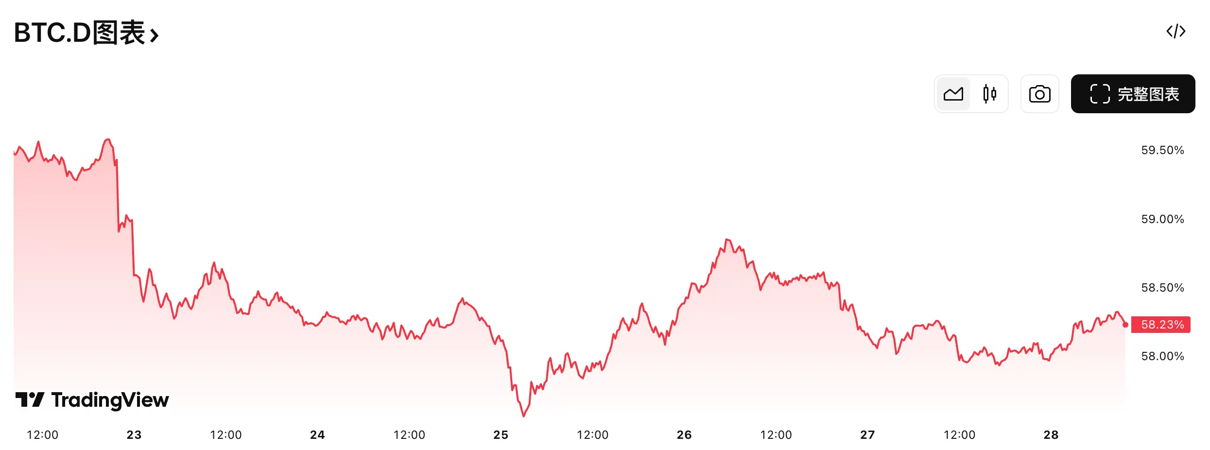 - 8 月 28 日数据显示,比特币市占率(BTC.D)本周下跌 1.85% 至 58.23%,一度跌破 58%。
