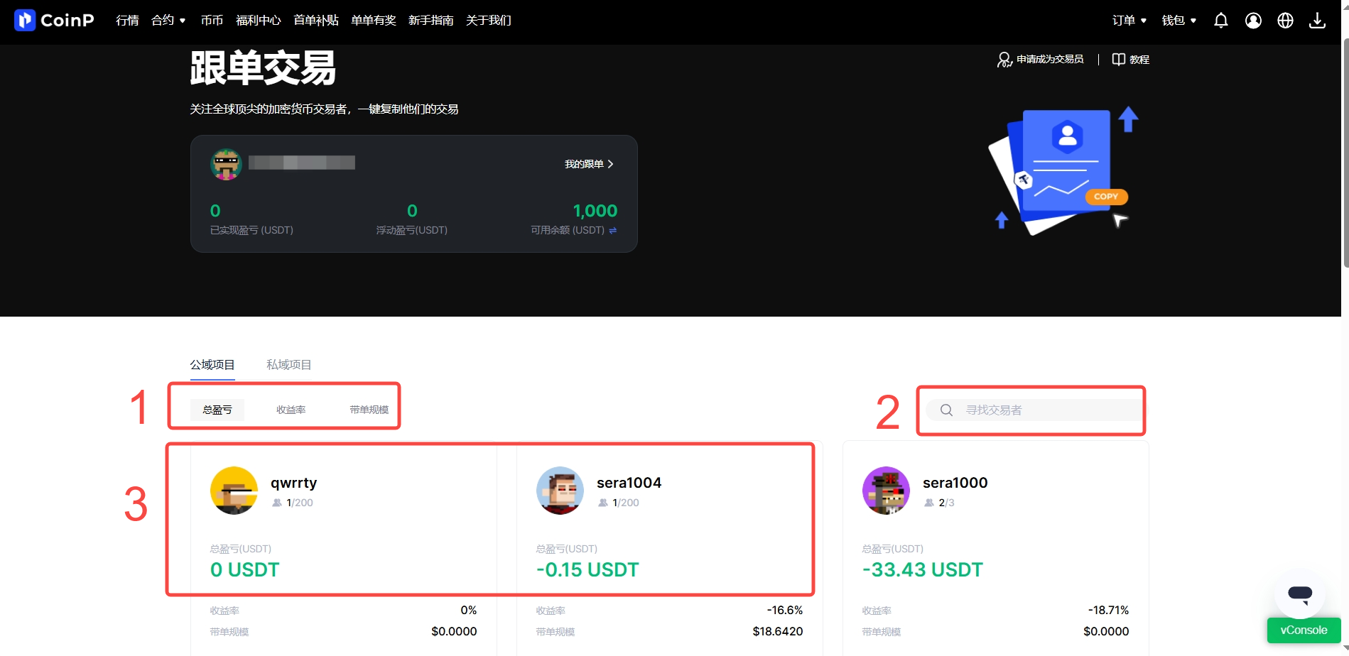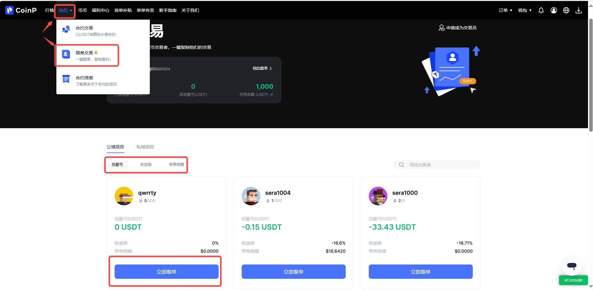1、打开 CoinP 官网 www.coinp.com 并登录账号,在顶部导航栏【合约】中选择【跟单交易】进入 CoinP 跟单交易页面。