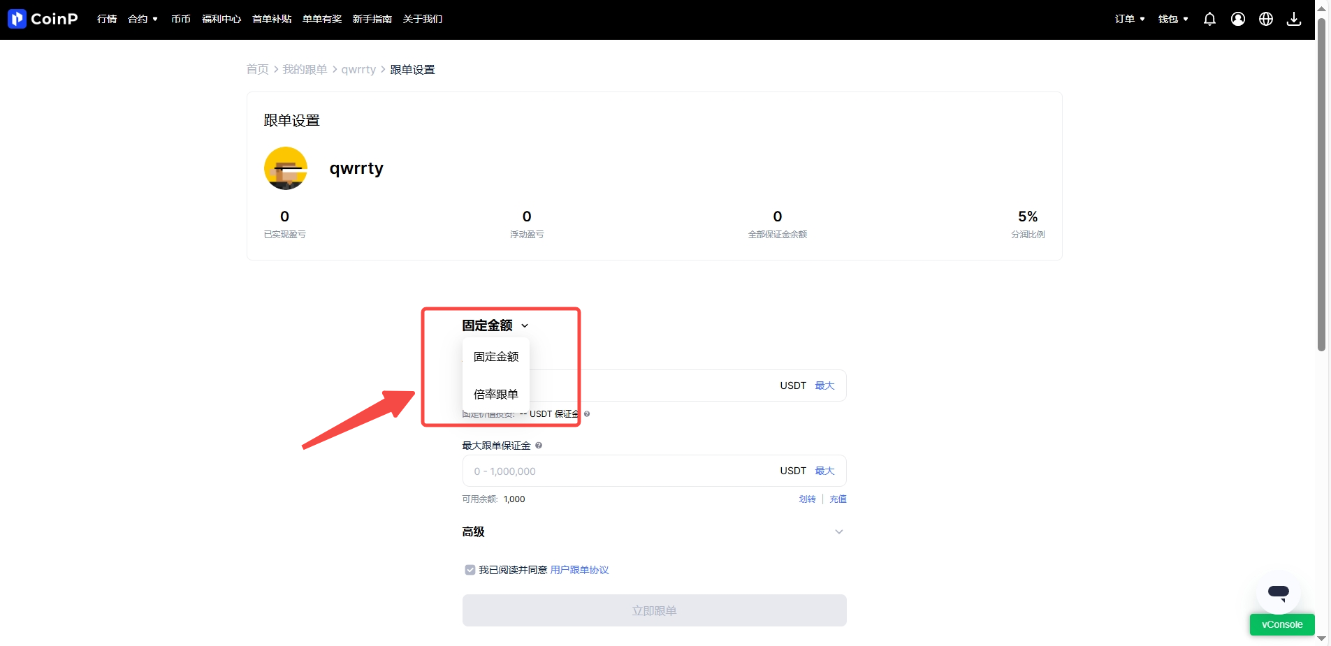 (1)修改跟单类型【固定金额】、【倍率跟单】