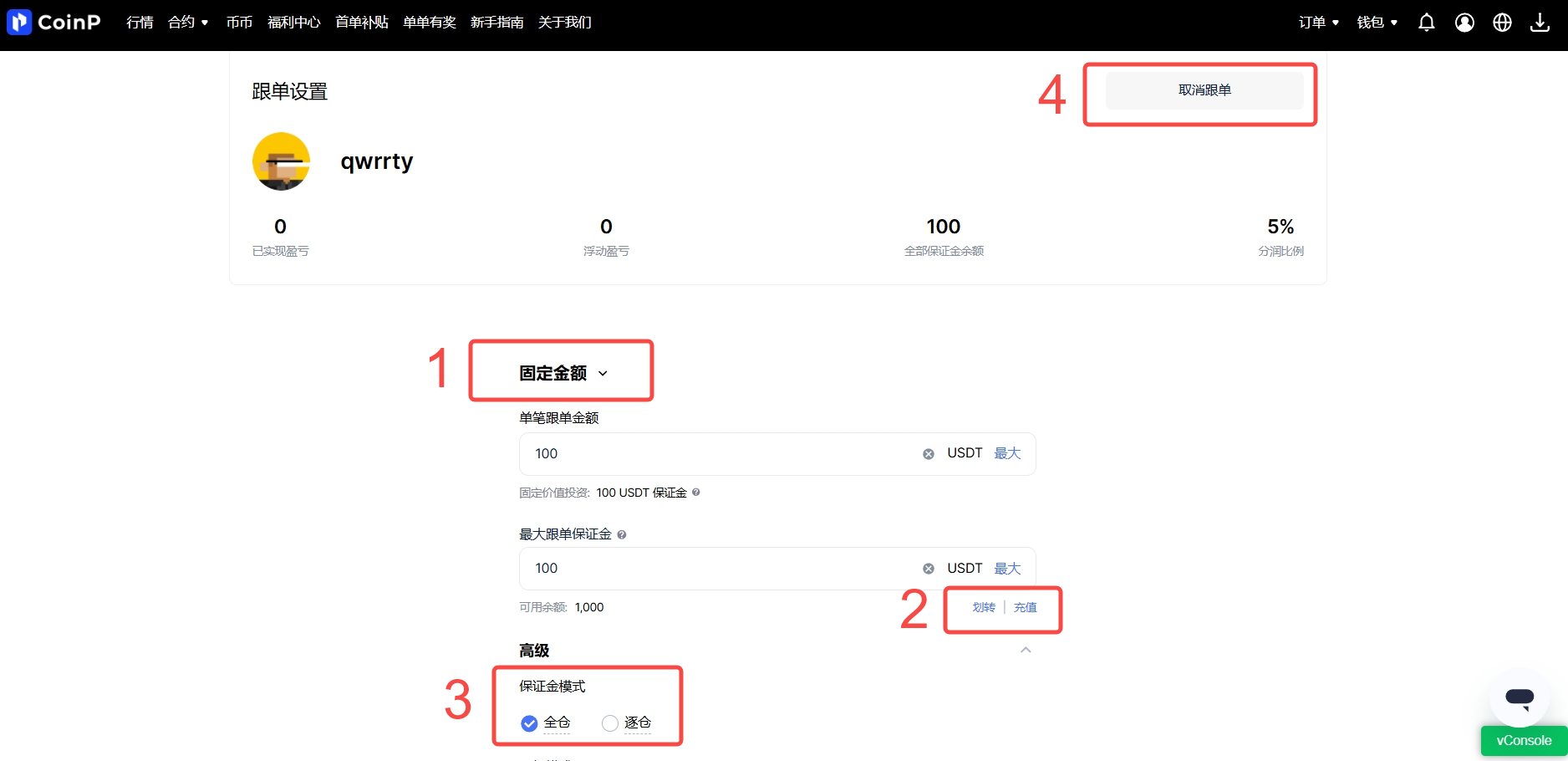 (3)调整【保证金模式】,当跟单当前交易员有仓位时,禁止调整【保证金模式】