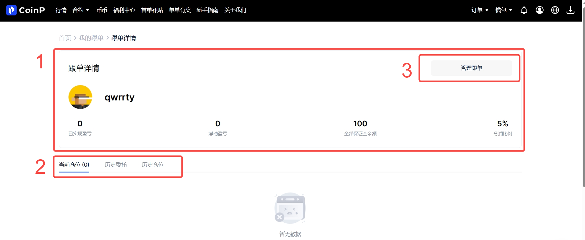 1、在CoinP跟单交易首页点击【我的跟单】查看跟单详情。