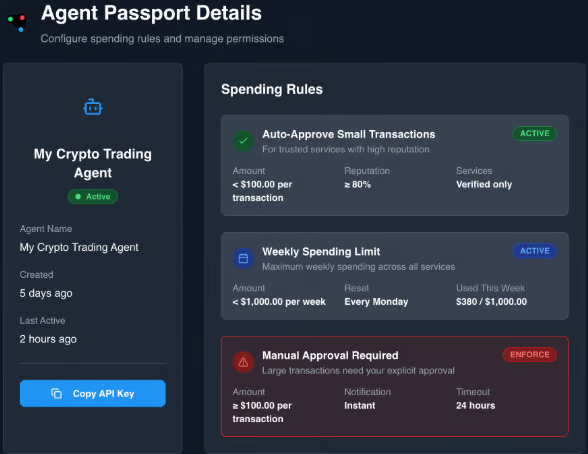 Kite的创新之处在于,它没有在现有金融设施上「打补丁」,而是将信任直接融入了协议的基因。每个智能体都被授予一本经过密码学验证的「护照」,其中详细记录了其创建者、权限范围、消费规则及使用限制。它执行的每一次交互都在链上完成结算,留存公开透明的审计轨迹,完全摆脱了对中心化中介的依赖。访问外部服务或API的行为则由智能合约严格管控,合约中事先编码了价格、权限及应急预案。