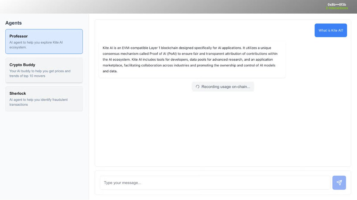 在Aero期间,Kite发布了几个内部演示智能体,包括生态向导The Professor、欺诈检测智能体Sherlock,以及追踪市场动态的Crypto Buddy。用户通过一个简单的聊天界面与它们互动,每一个指令都会在链上触发真实的推理、归因和奖励分配。