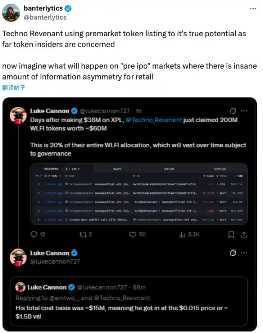 这也进一步引发了社区对近期火热的链上股权(Pre IPO)模式的担忧。KOL banterlytics 在 X 上表示,「看到了 TechnoRevenant 在代币的 Premarket 上已经产生了如此大的影响,想象如果发生在拥有更多内幕的 Pre IPO 上会如何」