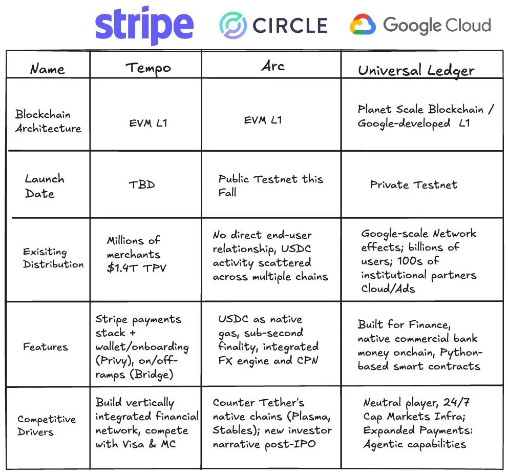 Stripe 的 Tempo 自然会倾向于 Stripe 的商家。Circle 的 Arc 围绕 USDC 构建。谷歌的卖点是它没有竞争的支付或稳定币业务,因此可以可靠地提供其他公司可能会采用的方案。