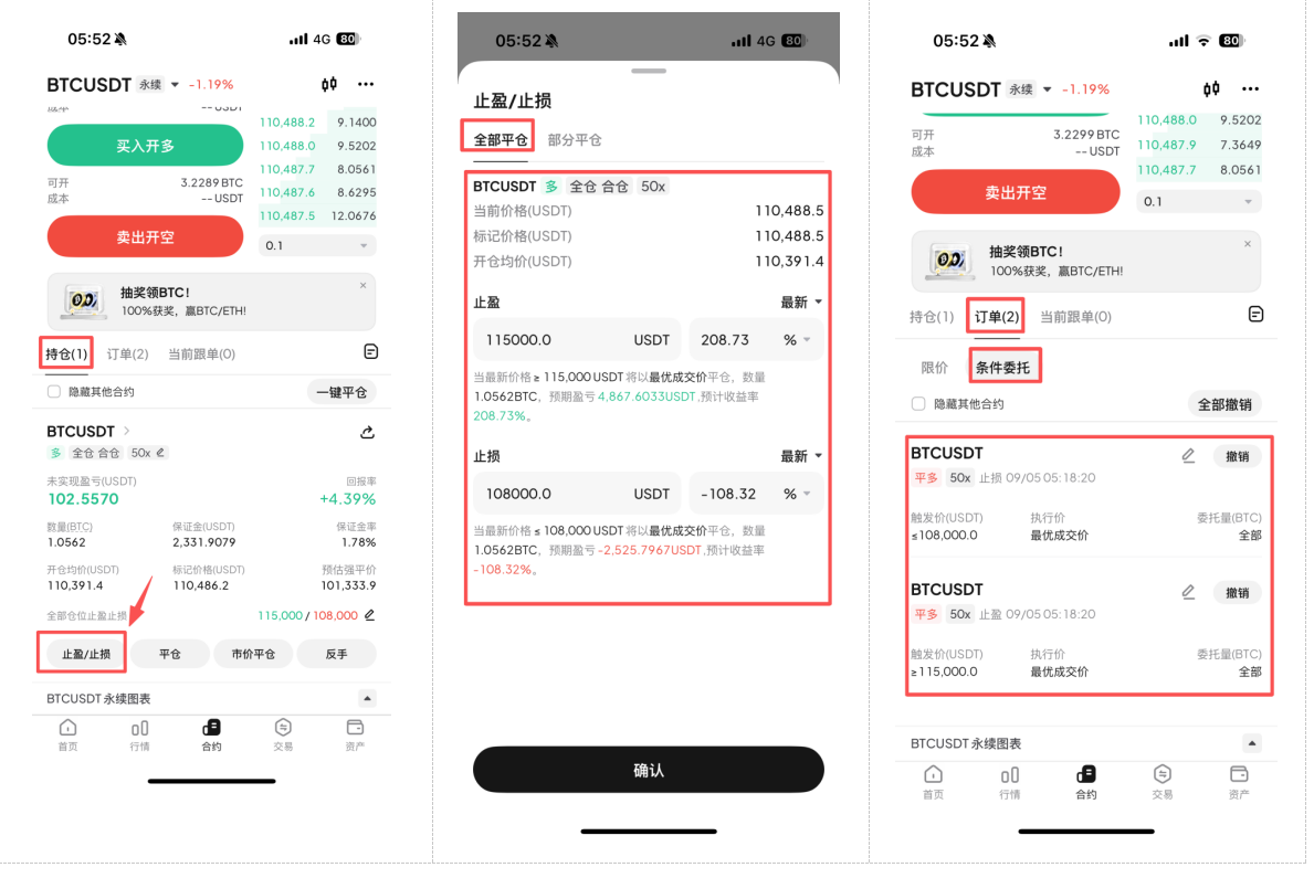 - 用户完成仓位的止盈/止损设置后,可以在订单界面的条件委托栏目中找到相应的止盈/止损委托订单。当币种价格触及委托价格时,系统会自动执行整笔仓位的市价平仓。