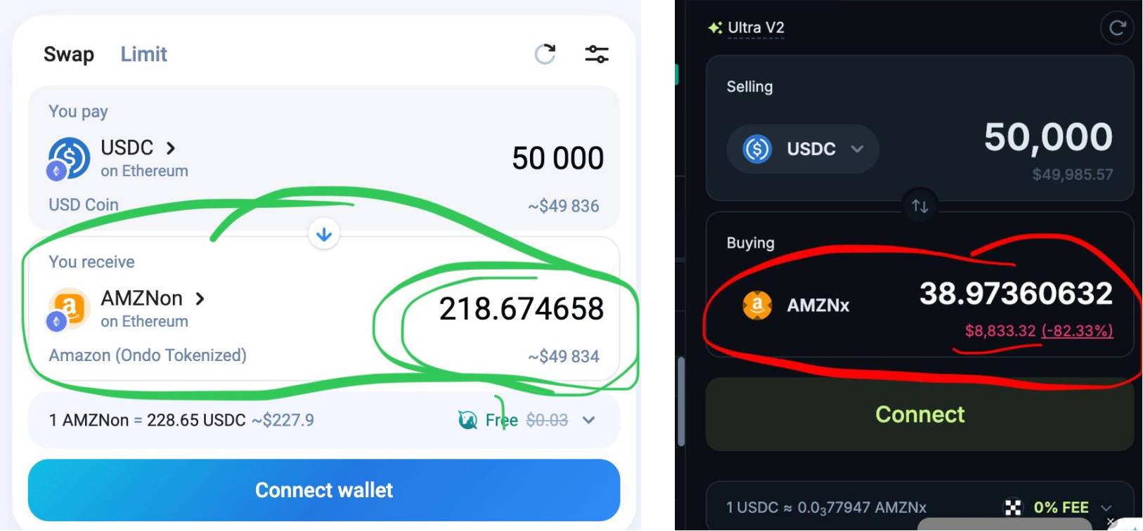 最近有推友分享了一组对比截图,直观展示了流动性差异。同样是5万美元USDC买亚马逊股票代币:在Ondo上可以买到218.67个AMZNon,价值49,834美元;而在xStocks上只能买到38.97个AMZNx,价值仅8,833美元,显示-82.33%的巨大滑点。