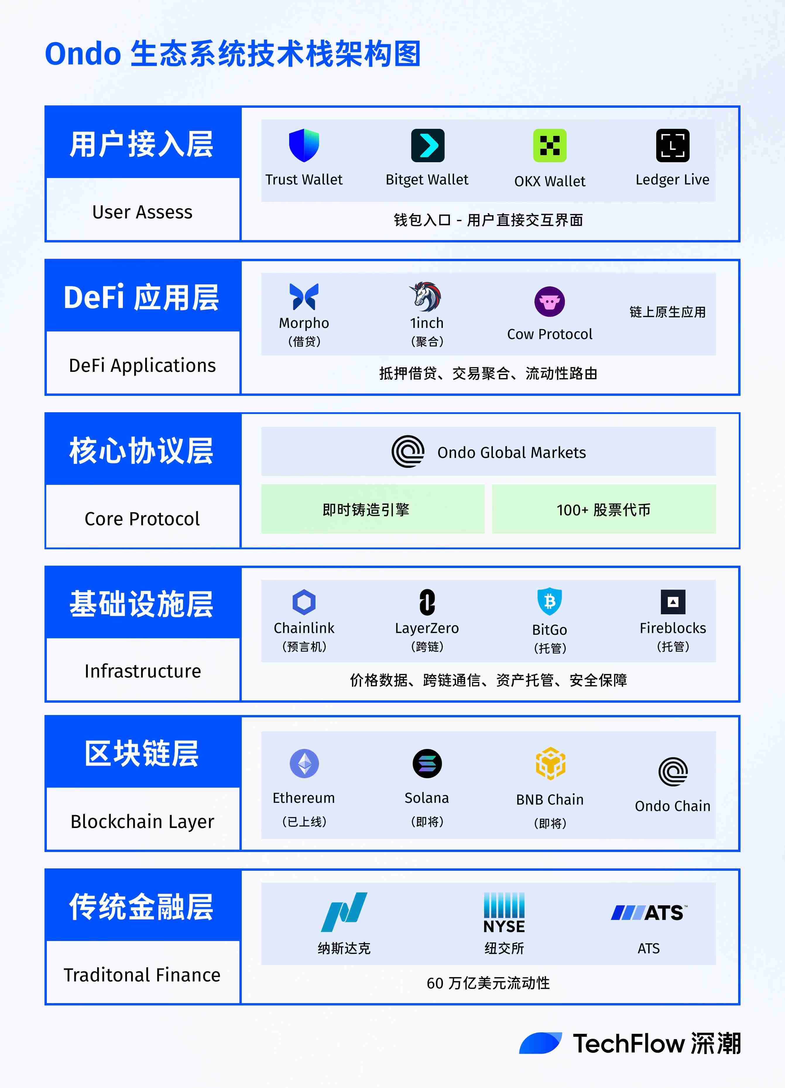 DeFi协议整合:Morpho已确认将接受Ondo股票代币作为抵押品。这意味着你可以用特斯拉股票在DeFi中借贷。1inch和CoW Protocol的聚合交易功能让流动性能在各个平台间自由流动。